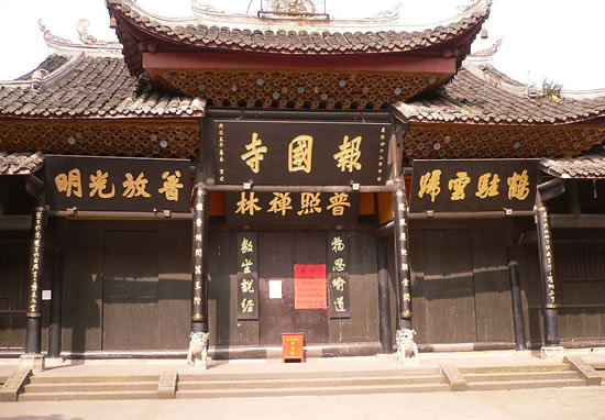 报国寺坐落于峨嵋山麓,是山下的第一座寺庙,峨嵋的进山门户。该寺建于明万历年间,为全山八大名寺之一,寺内正殿原供奉着佛、道、儒三教的代表,曾名“会宗堂”,有“三教会宗”的意思,清康熙帝取佛门“报国主恩”意,改为报国寺。山门悬有康熙书“报国寺”匾额;正殿悬有“宝相庄严”匾。殿宇雄伟,有弥勒殿、大雄殿、七佛殿和藏经楼四重屋宇,依山而建,逐级升高。